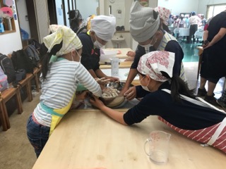 高根クラインガルテンで、ほうとうづくりをしています。野菜を切って、粉をこねているところです。おいしいほうとうができるといいですね!グループで協力して頑張っています。